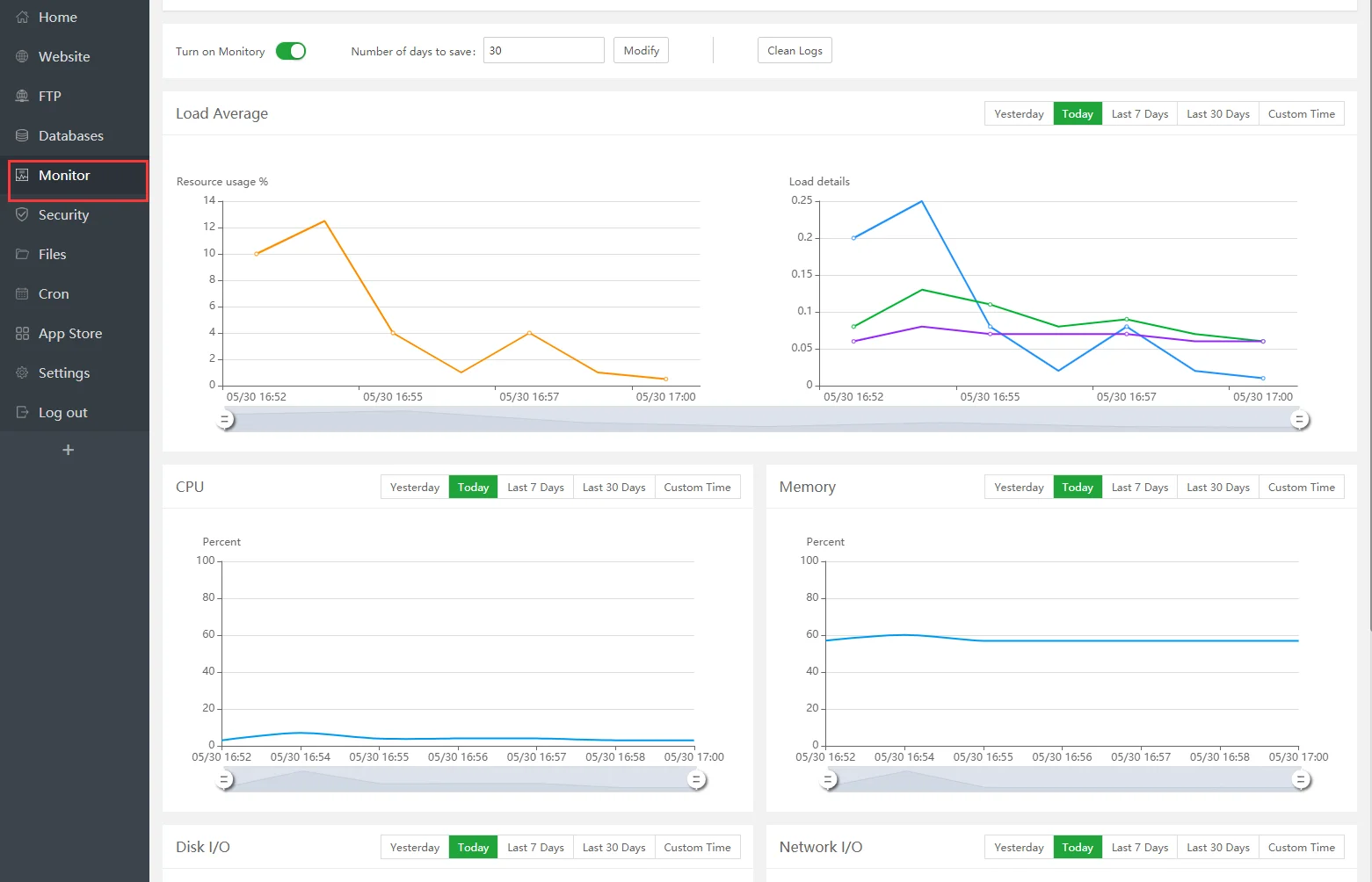 aaPanel provides a System Resource Monitoring page where you can monitor your server’s CPU, memory, and disk usage. You can view graphs of resource usage over time and identify any spikes or unusual patterns. This information can help you optimize your server’s performance and ensure that it is running smoothly.