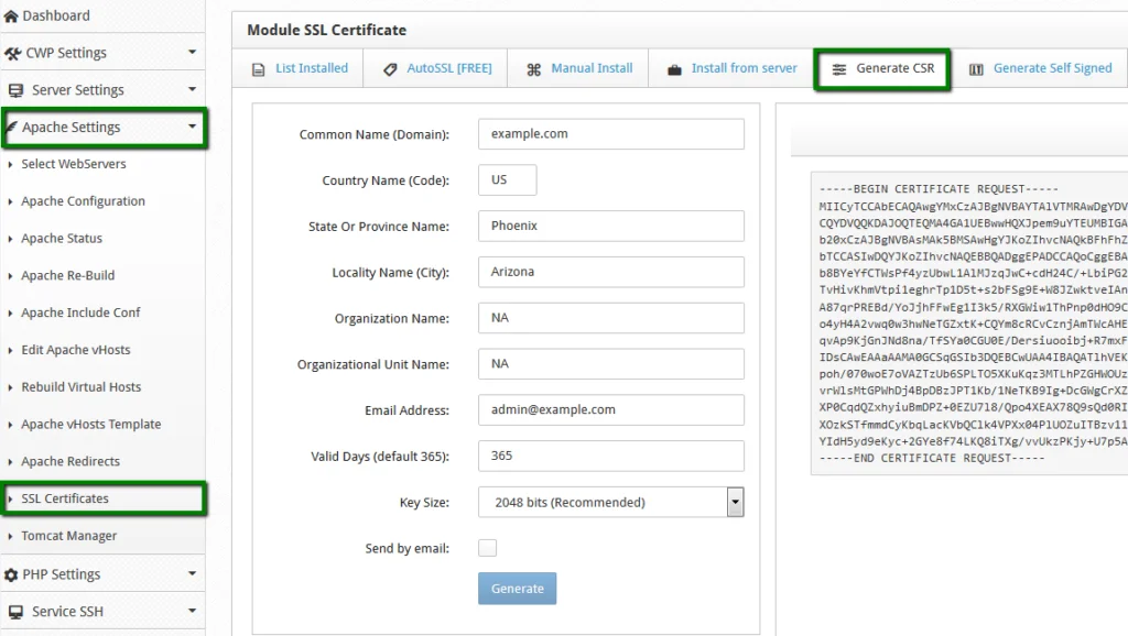 - Select SSL Certificates from Apache Settings and switch to the Generate CSR tab.