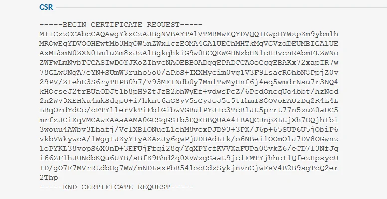 The CSR code will be located at the bottom of the next page. Please include —–BEGIN CERTIFICATE REQUEST—– and —–END CERTIFICATE REQUEST—– when submitting the CSR code for SSL activation.