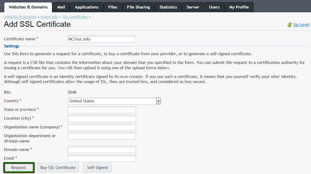 On the next page enter the Certificate Name to easily recognize the certificate among the others on the server and fill in the required information for the CSR code: