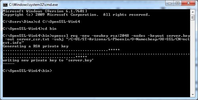 *OpenSSL base folder*\bin\openssl.exe req -new -newkey rsa:2048 -nodes -keyout *Some path*\server.key -out *Some path*\server_csr.txt