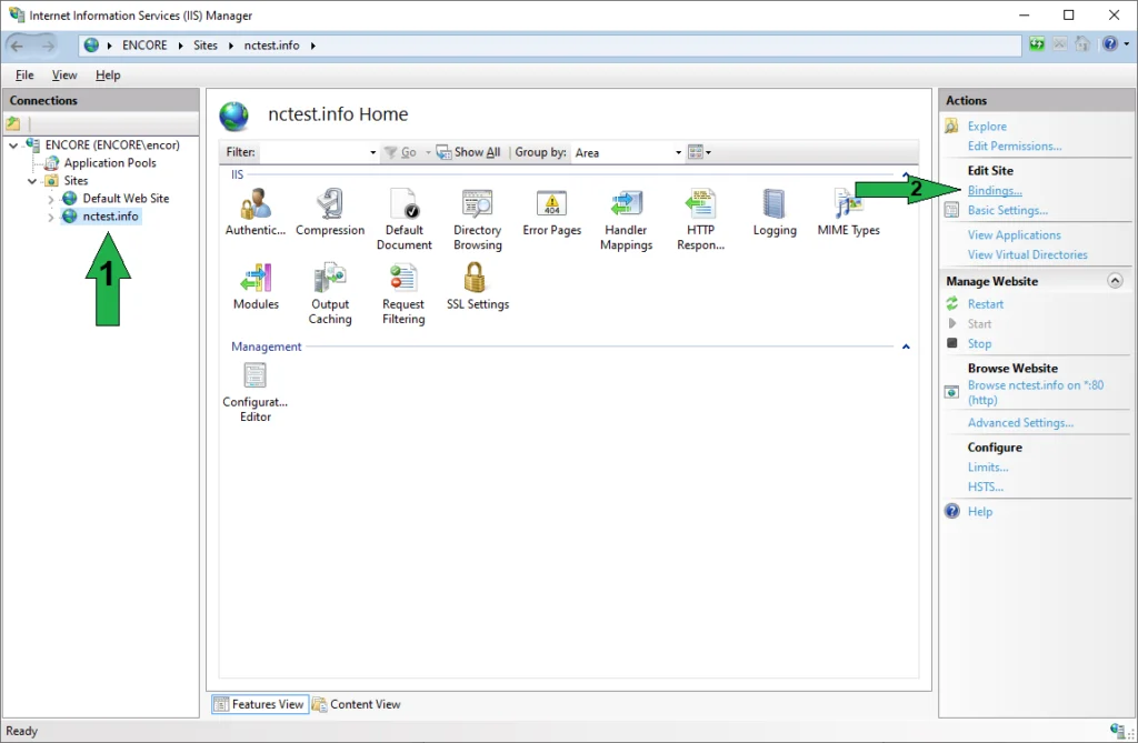 1) To do this, select the Sites folder in the Connections panel on the left side of IIS Manager and click on the corresponding site. Then, in the Actions panel on the right side, select Bindings….