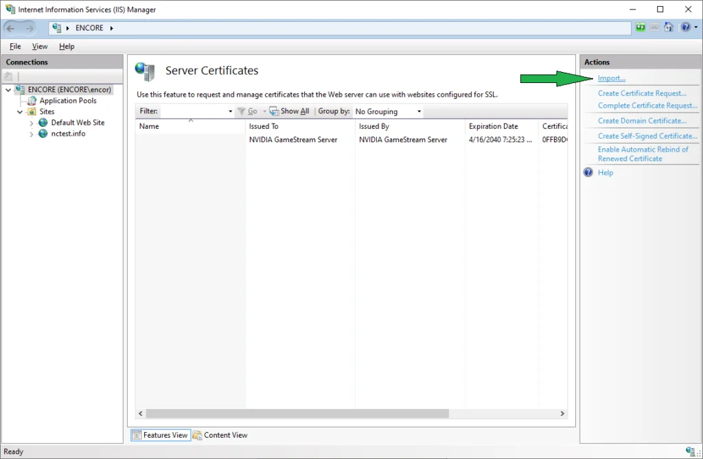 Once the certificate has been imported by any of the methods described above, it will be shown in the list of server certificates in IIS Manager.