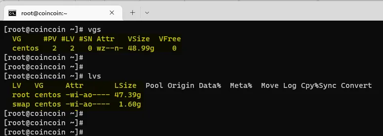 #Run command `vgs` to check the storage of Volume Group (VG)