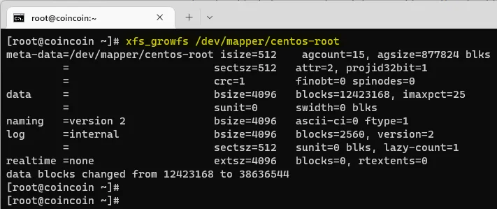 • `/dev/mapper/centos-root` is the device file for the `xfs` file system. When you run the `xfs_growfs` command with this device file as the argument, the `xfs_growfs` utility will resize the file system to use the additional space on the underlying block device.