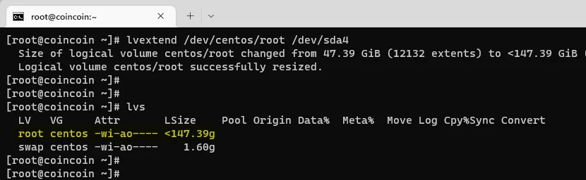 Initially, the Logical Volume root was only 47.39GB, now it is increased to 147.39GB.