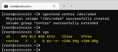 Initially, Volume Group centos were only 48.99 GB, now it is increased to 148.99 GB.